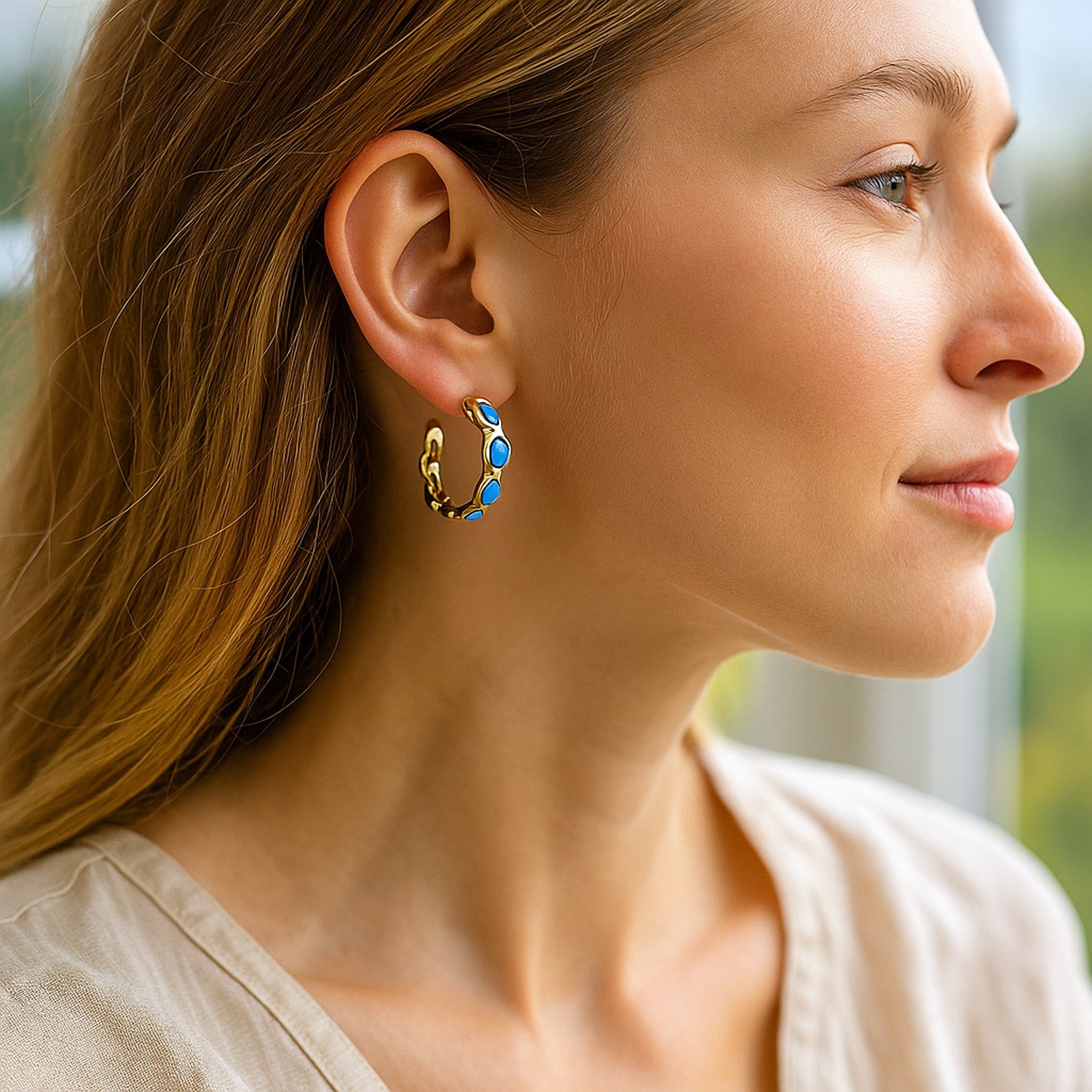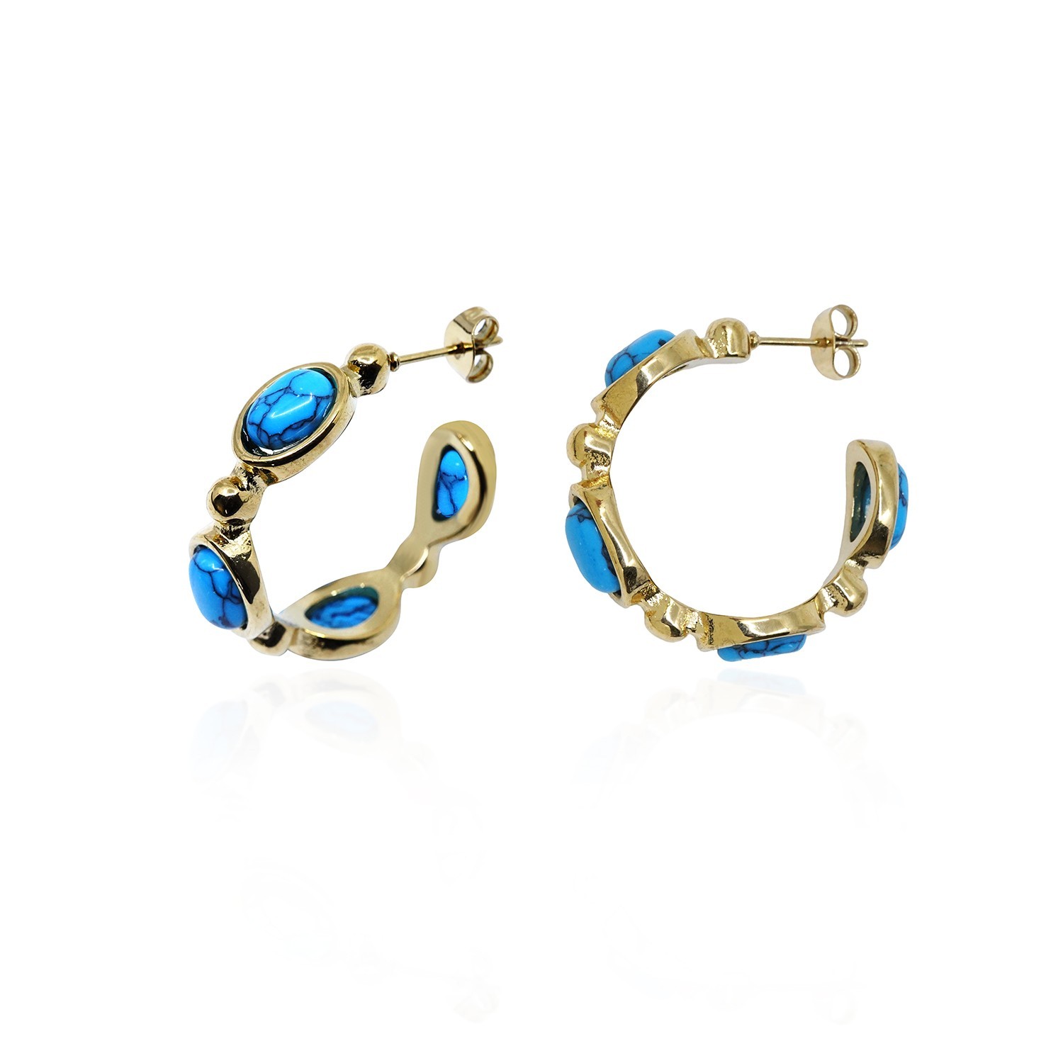 Ατσάλινα Σκουλαρίκια Κρίκοι με Χαολίτη Κρίκοι από ανοξείδωτο ατσάλι σε χρυσαφί απόχρωση, διακοσμημένοι με χαολίτη σε έντονο γαλάζιο. Ένα statement κομμάτι που προσθέτει ζωντάνια και κοσμική ενέργεια σε κάθε εμφάνιση