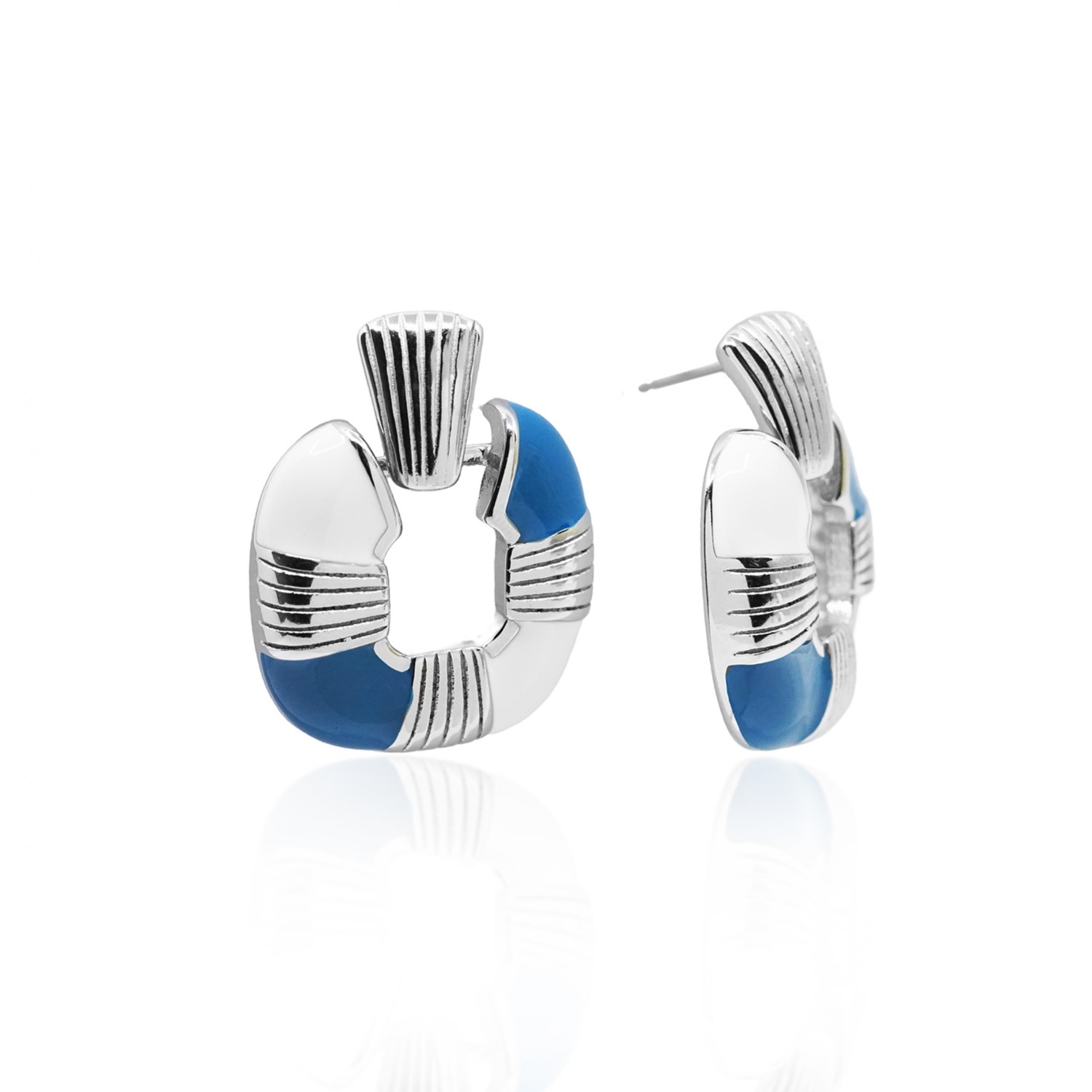 Ατσάλινα Σκουλαρίκια με Σμάλτο Ατσάλινα σκουλαρίκια σε μοντέρνο σχέδιο με έντονες γραμμές και διχρωμία από σμάλτο σε λευκό και μπλε. Ένα statement κομμάτι που αποπνέει δυναμισμό και καλοκαιρινή διάθεση