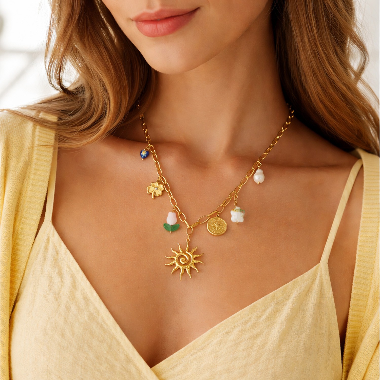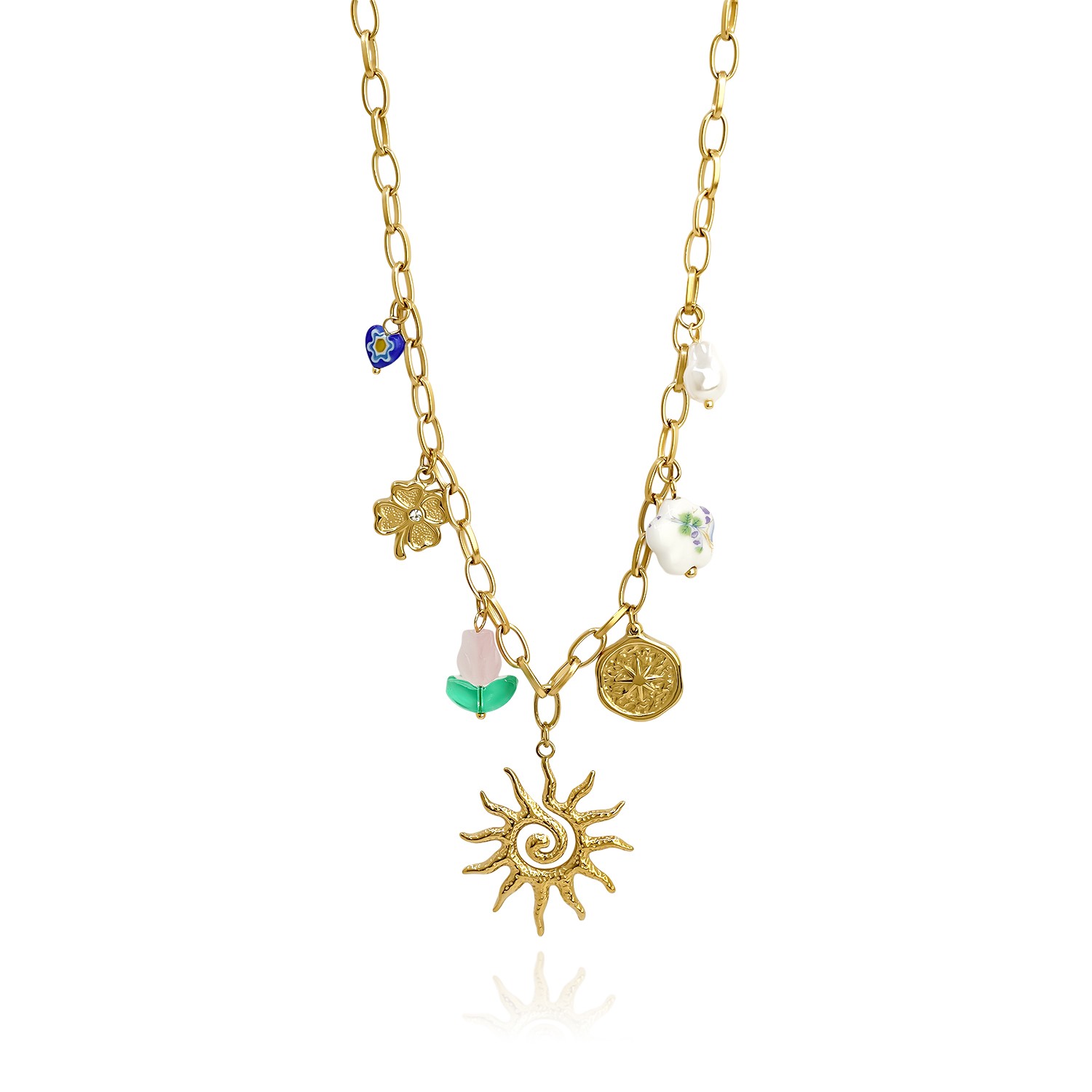 Κολιέ με ατσάλινη αλυσίδα, κεραμικά στοιχεία και charms