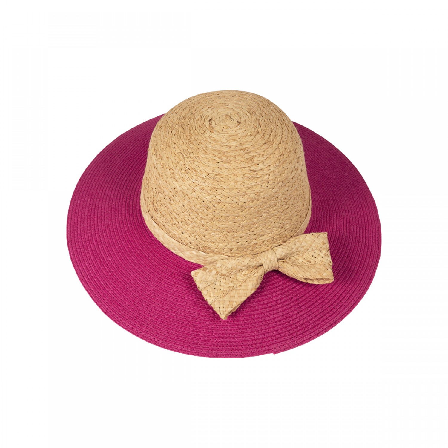 Ψάθινο καπέλο Panama με φιόγκο και διχρωμία σε φούξια χρώμα