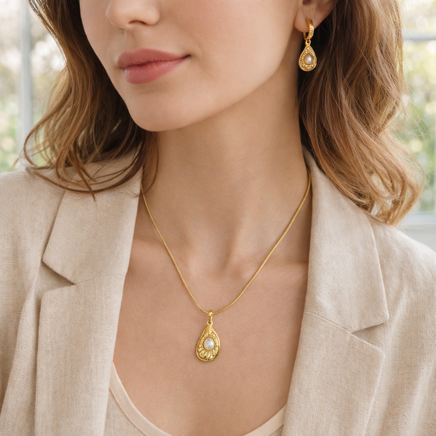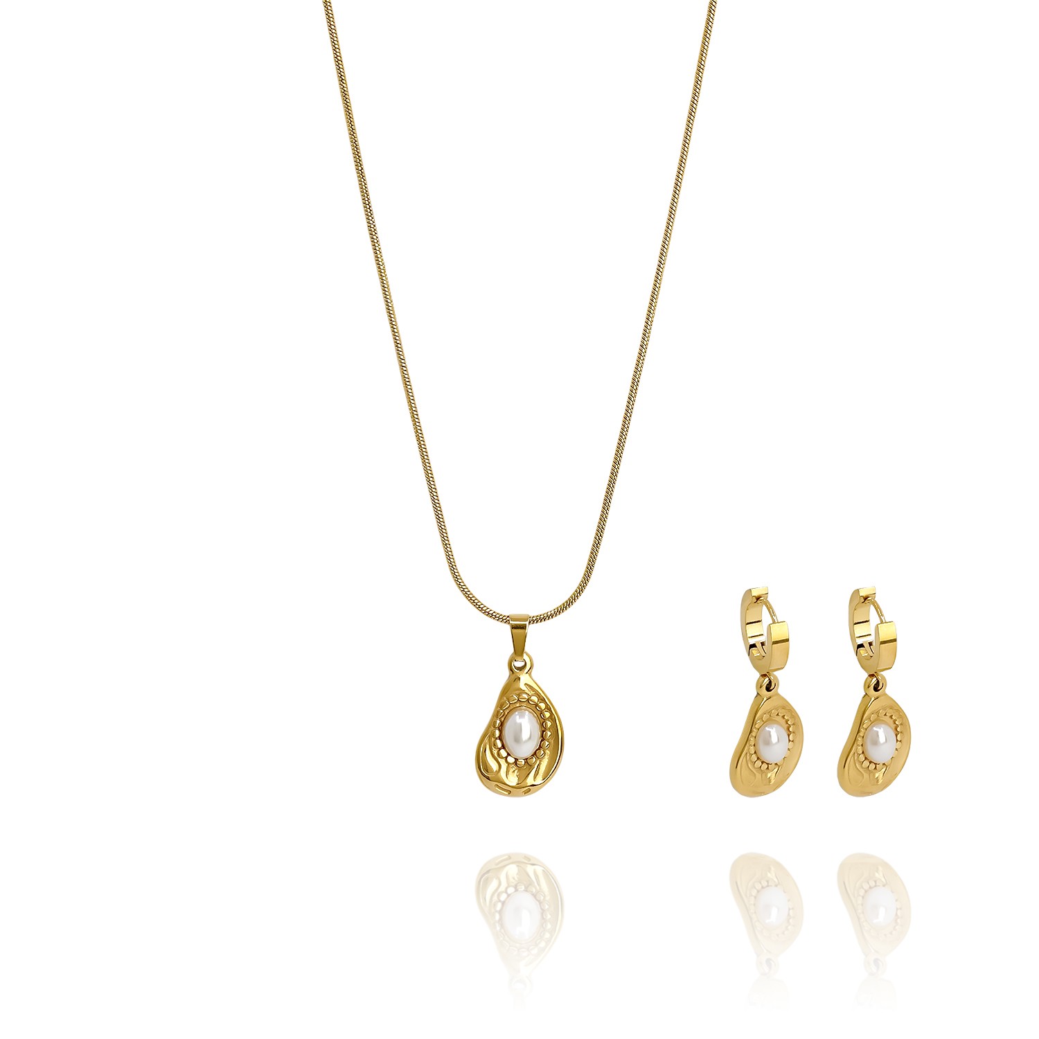 Σετ κολιέ και σκουλαρίκια με ατσάλινη αλυσίδα και δάκρυ με πέρλα