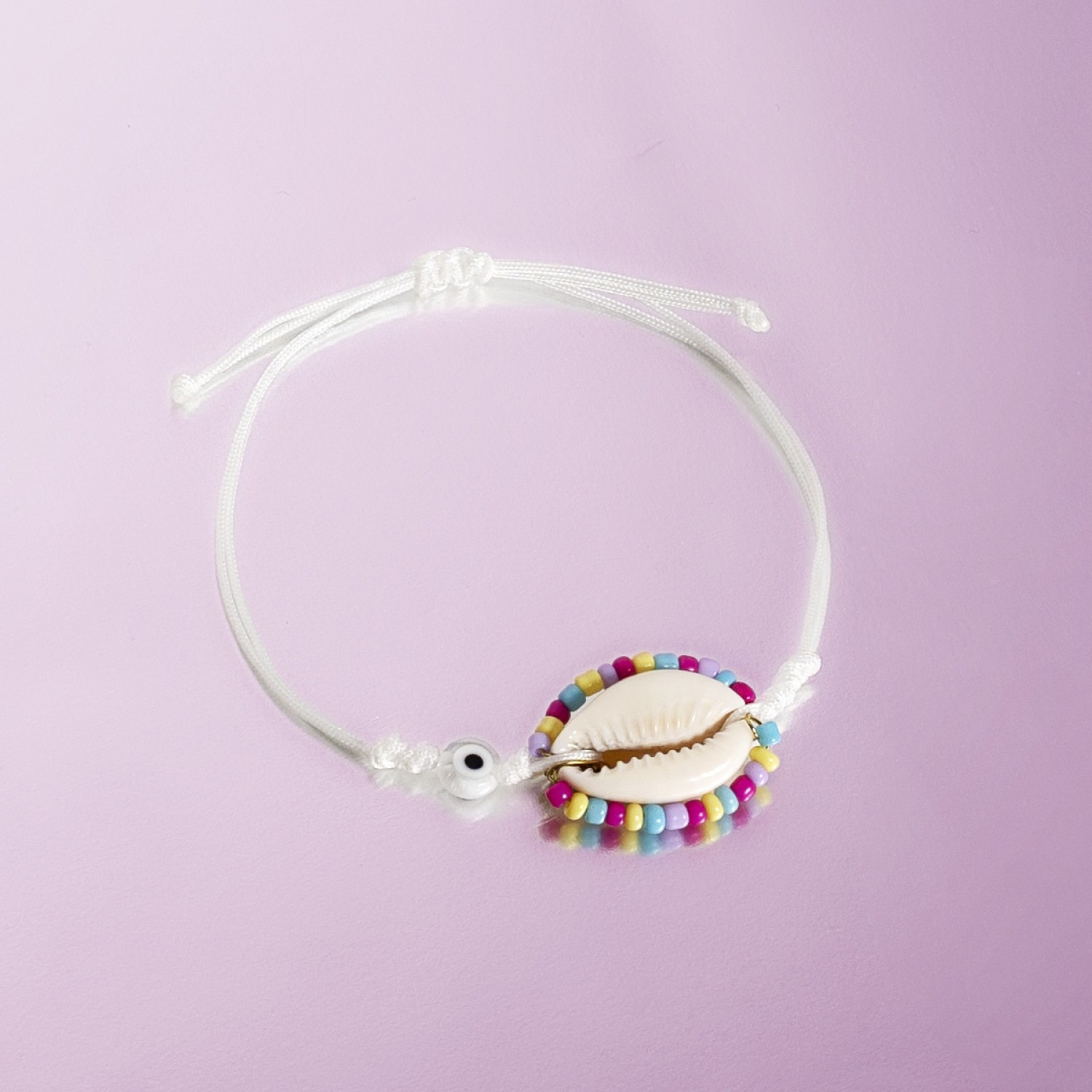 Χειροποίητο βραχιόλι με νάυλον κορδόνι, κοχύλι διακοσμημένο με πολύχρωμες χάντρες και ματάκι